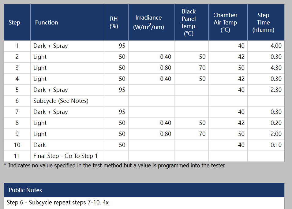 Q-Sun Xe-3-HSE系列氙燈試驗(yàn)箱符合ASTM D7869測試標(biāo)準(zhǔn),該系列氙燈設(shè)備采用三支氙弧燈管模擬戶外的全光譜太陽光,具備輻照度控制,BP黑板/IBP黑標(biāo)溫度監(jiān)控,箱內(nèi)空氣溫度可控,相對濕度連續(xù)可調(diào)節(jié),水噴淋模擬降水對材料的破壞效果。在運(yùn)行該測試標(biāo)準(zhǔn)時(shí),具體的設(shè)置運(yùn)行條件如下圖: