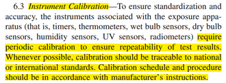 翻譯:儀器校準(zhǔn)--為了保證標(biāo)準(zhǔn)和精度,儀器的裝置(包括計(jì)時(shí)器、溫度計(jì)、濕燈泡傳感器、干燈泡傳感器、濕度探頭、紫外探頭、輻照度計(jì)等)要求階段性地校準(zhǔn)以確保測(cè)試結(jié)果的重復(fù)性。無論可能何時(shí),校準(zhǔn)都必須可溯源到國(guó)際標(biāo)準(zhǔn)。校準(zhǔn)步驟參照生產(chǎn)商手冊(cè)。