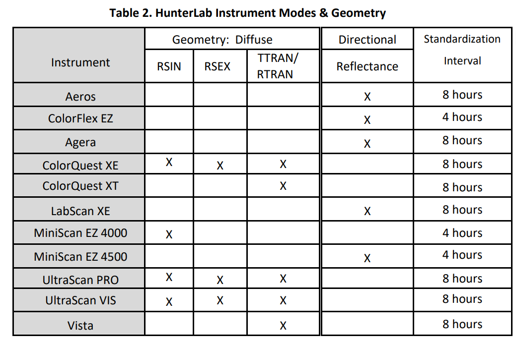 從Hunterlab自帶的各個儀器的說明書上,我們可以明確由于儀器結構和型號不同,各款儀器的校正時間也略有不同,如下圖所示: