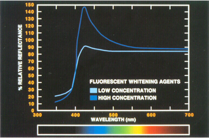 熒光增白劑(FWA)通常用于紡織、造紙和塑料行業(yè),使產品在陽光或其他包含紫外線(UV)的光源下觀察時看起來更亮麗。下圖說明了這種美白劑的光譜效應。請注意,高濃度的 FWA 在大約 420 nm 處將光譜反射率提高 100% 以上。