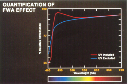 如果將帶有UV濾光片的樣品讀數與帶有UV濾光片在其標稱位置1的樣品讀數進行比較,則可以量化FWA的影響。ASTM方法 E1247 “通過分光光度法識別物體顏色標本中熒光的標準測試方法”中描述了一種方法。包含和排除UV(分別為UV濾光片輸出和輸入)的光譜曲線示例如下所示。在較低波長下,UV excluded 曲線遠低于UVincluded 曲線。