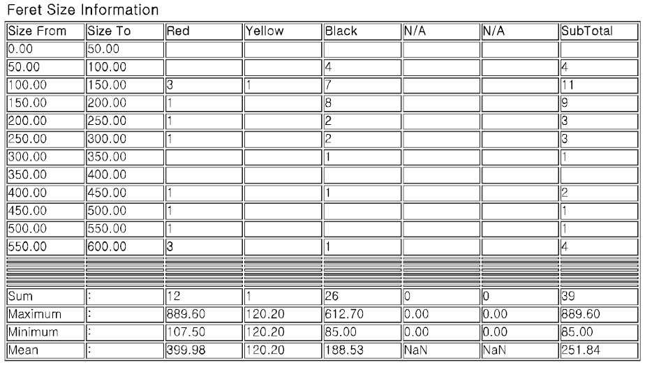 儀器檢測(cè)完成后自動(dòng)生成黑點(diǎn)異色檢測(cè)報(bào)告,檢測(cè)到的雜質(zhì)會(huì)在報(bào)告中提供雜質(zhì)圖像,并且包含雜質(zhì)尺寸、顏色(黑點(diǎn)異色)、形狀信息。除圖像信息外,還會(huì)提供詳細(xì)的雜質(zhì)數(shù)量統(tǒng)計(jì)信息(根據(jù)自定義的雜質(zhì)顏色和尺寸范圍進(jìn)行分級(jí)統(tǒng)計(jì)),詳見下圖: