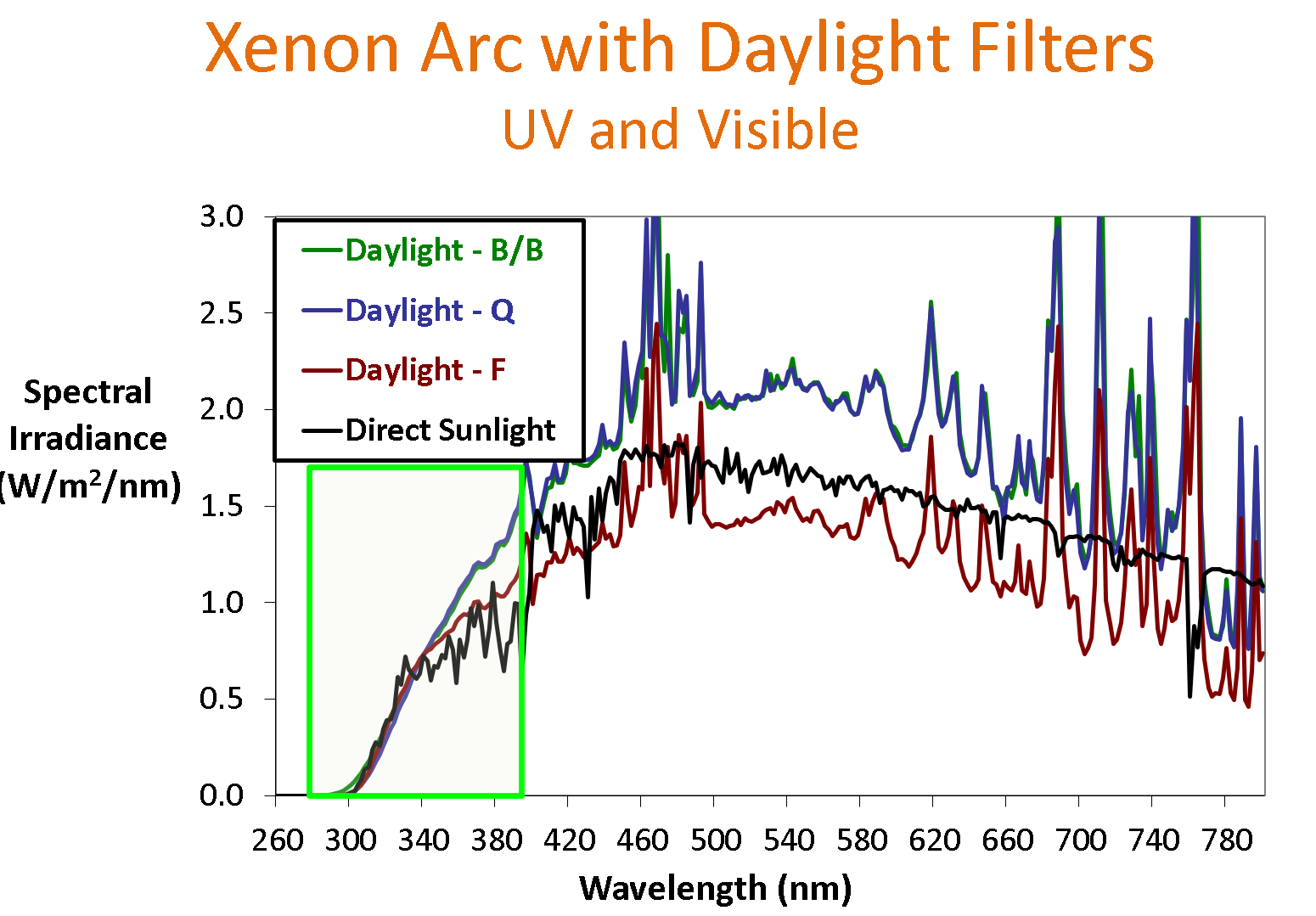 日光濾光器用來模擬戶外直射陽(yáng)光。它與大多數(shù)的戶外應(yīng)用環(huán)境具有最佳的相關(guān)性。通常在戶外使用的材料,如屋頂或戶外涂料,應(yīng)使用日光濾光器進(jìn)行測(cè)試。Q-SUN氙燈試驗(yàn)箱有三不同類型的日光濾光器可選:Daylight – F、Daylight – Q 和Daylight - B/B。這些包括了ASTM和ISO標(biāo)準(zhǔn)中定義的I型和II型日光過濾器。
