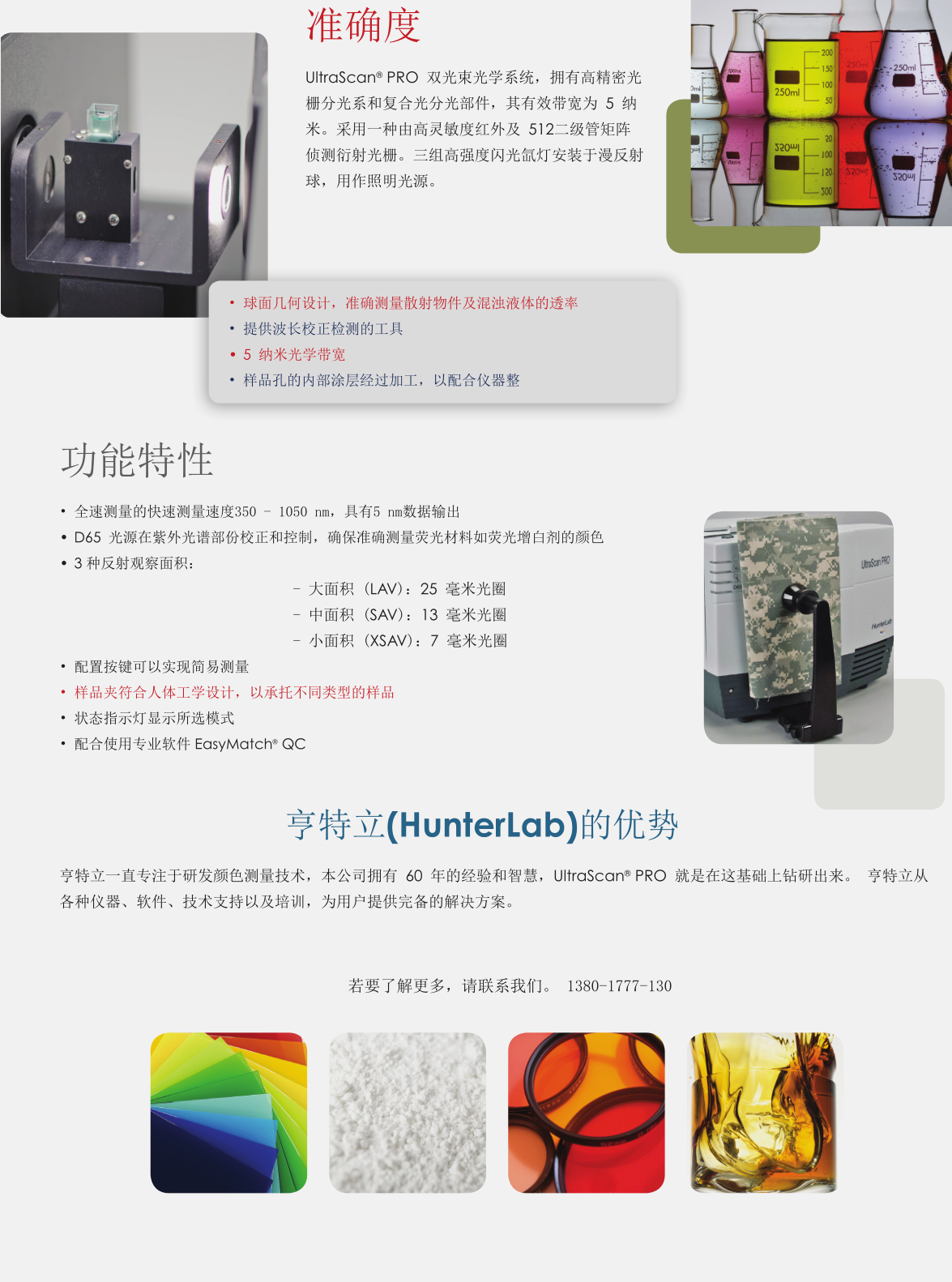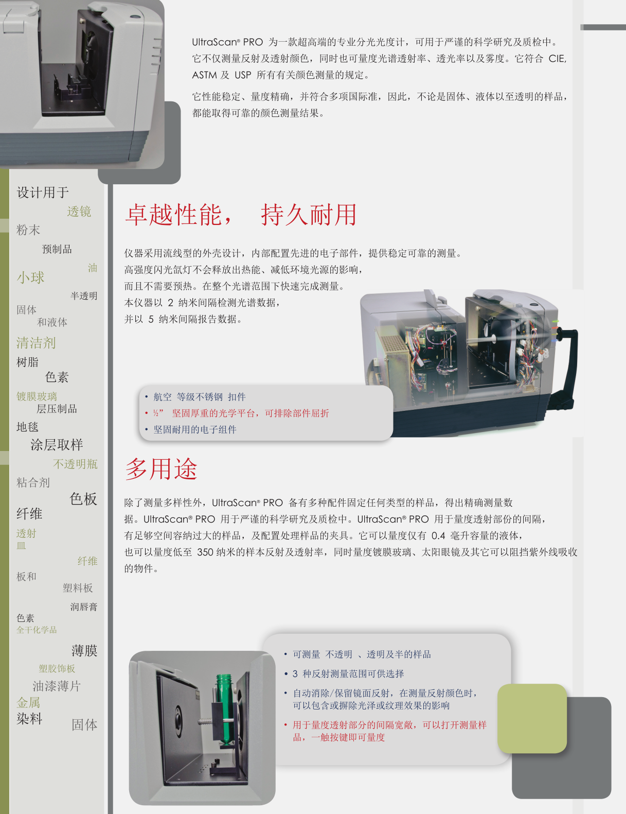 HunterLab UltraScan Pro是當(dāng)今世界上商業(yè)積分球色差儀中專業(yè)的一款。其光譜涵蓋近紫外、CIE標(biāo)準(zhǔn)可見(jiàn)光、近紅外三個(gè)部分。