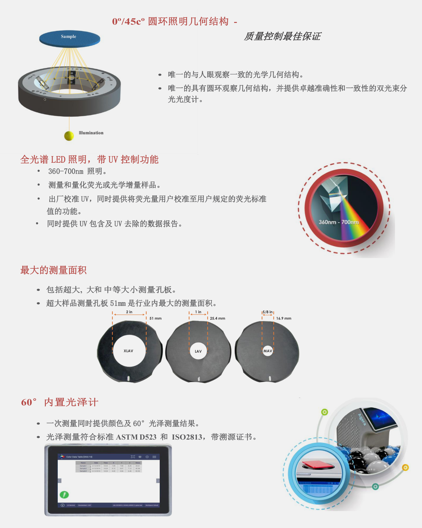 | 光學(xué)結(jié)構(gòu) | 0°/45° (環(huán)形測(cè)量)符合 ASTM E1164 |