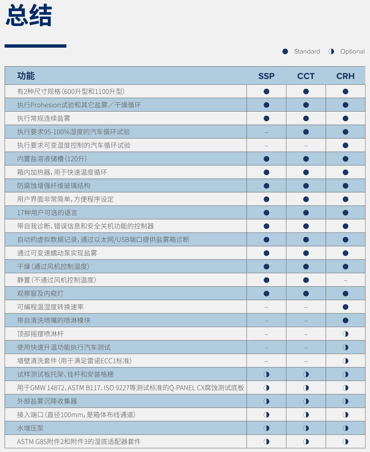 Q-FOG CRH循環(huán)腐蝕試驗箱代表了在相對濕度控制的腐蝕試驗箱性價比方面的真正突破。它可以執(zhí)行大多數(shù)汽車腐蝕試驗標(biāo)準(zhǔn)包括GMW 14872, SAE J2334以及Ford, ISO, GB/T, VW, Volvo, Chrysler, Renault, JASO的其他標(biāo)準(zhǔn)。 該循環(huán)腐蝕試驗箱具備循環(huán)腐蝕試驗箱該具備的所有特性和優(yōu)勢,并通過創(chuàng)新的空氣預(yù)調(diào)節(jié)器來實現(xiàn)全面的相對濕度控制。此外,CRH型號還具備噴淋功能,可與傳統(tǒng)鹽霧相互切換使用。與傳統(tǒng)的鹽霧噴霧功能相比,CRH噴淋功能的霧滴更大、流速更高、噴淋時間更短。噴淋裝置可安裝在中心位置,也可安裝成在頂部擺動的噴淋桿,以滿足某些關(guān)鍵腐蝕測試中的強(qiáng)制性要求。CRH還有先進(jìn)的噴嘴清潔功能,可預(yù)防其他品牌鹽霧箱經(jīng)常出現(xiàn)的噴嘴堵塞現(xiàn)象。 在一臺Q-FOG CRH箱體中,可以實現(xiàn)一系列重要的腐蝕環(huán)境的循環(huán)。即使是非常復(fù)雜的測試循環(huán)也可以很容易地用Q-FOG控制器進(jìn)行編程。Q-FOG-循環(huán)腐蝕試驗箱符合標(biāo)準(zhǔn)的詳細(xì)列表請參考LF-8131 – Standards Met by Q-FOG Testers或訪問標(biāo)準(zhǔn)頁面。