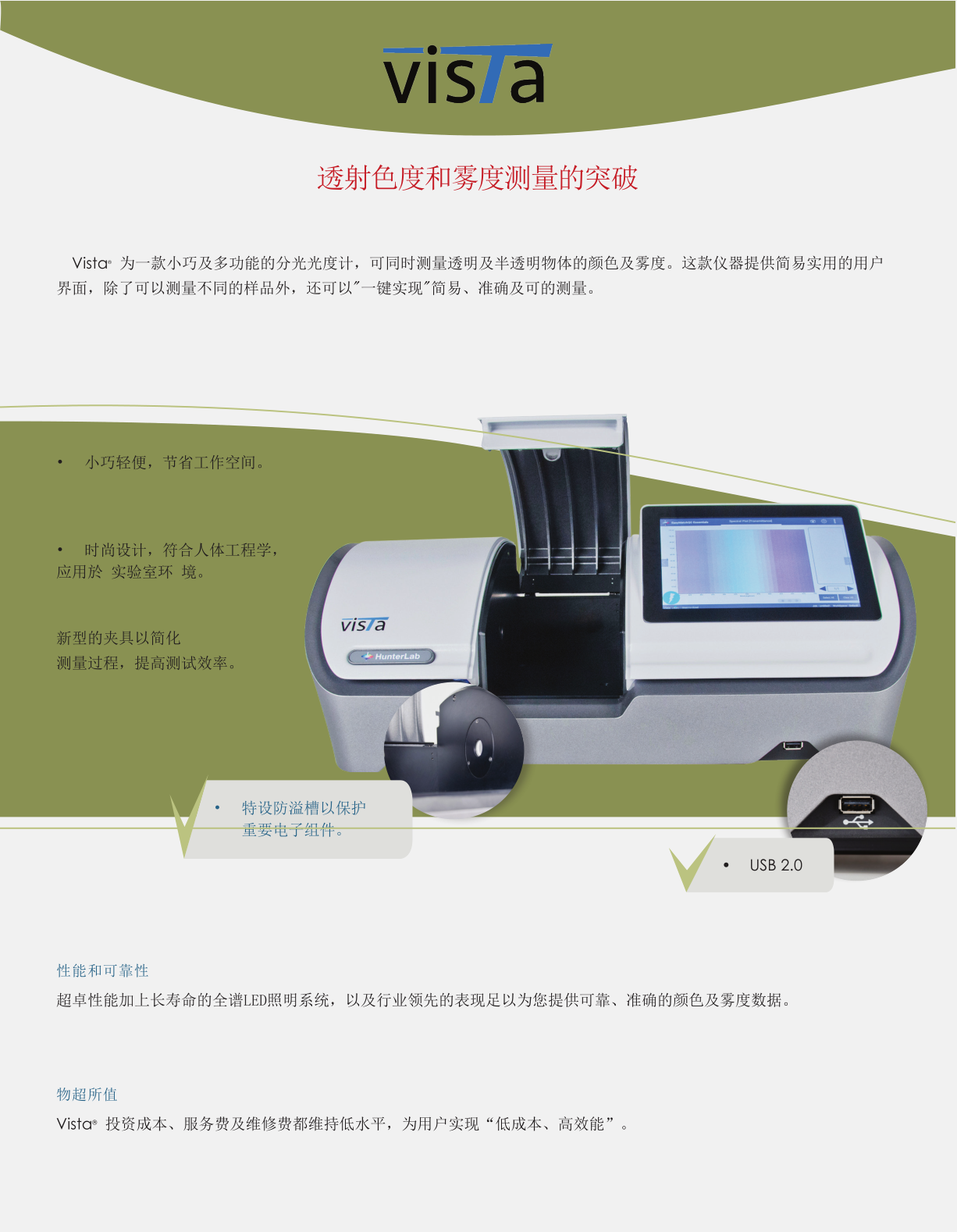 相比其它產(chǎn)品,Vista的優(yōu)勢(shì)非常明顯:一臺(tái)機(jī)器滿足色差儀和霧度儀的兩臺(tái)功能,高溫鉑鈷色度、液體和油品色度測(cè)量時(shí)間只要2.5秒,霧度只要5秒,價(jià)格低,質(zhì)量好,壽命長。