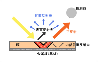 在具有膜厚度信息的光在金屬板(基材)反射,形成正反射光和四處擴(kuò)散的反射光。主要適合于基材較平滑且具有一定反射能力的表面。
