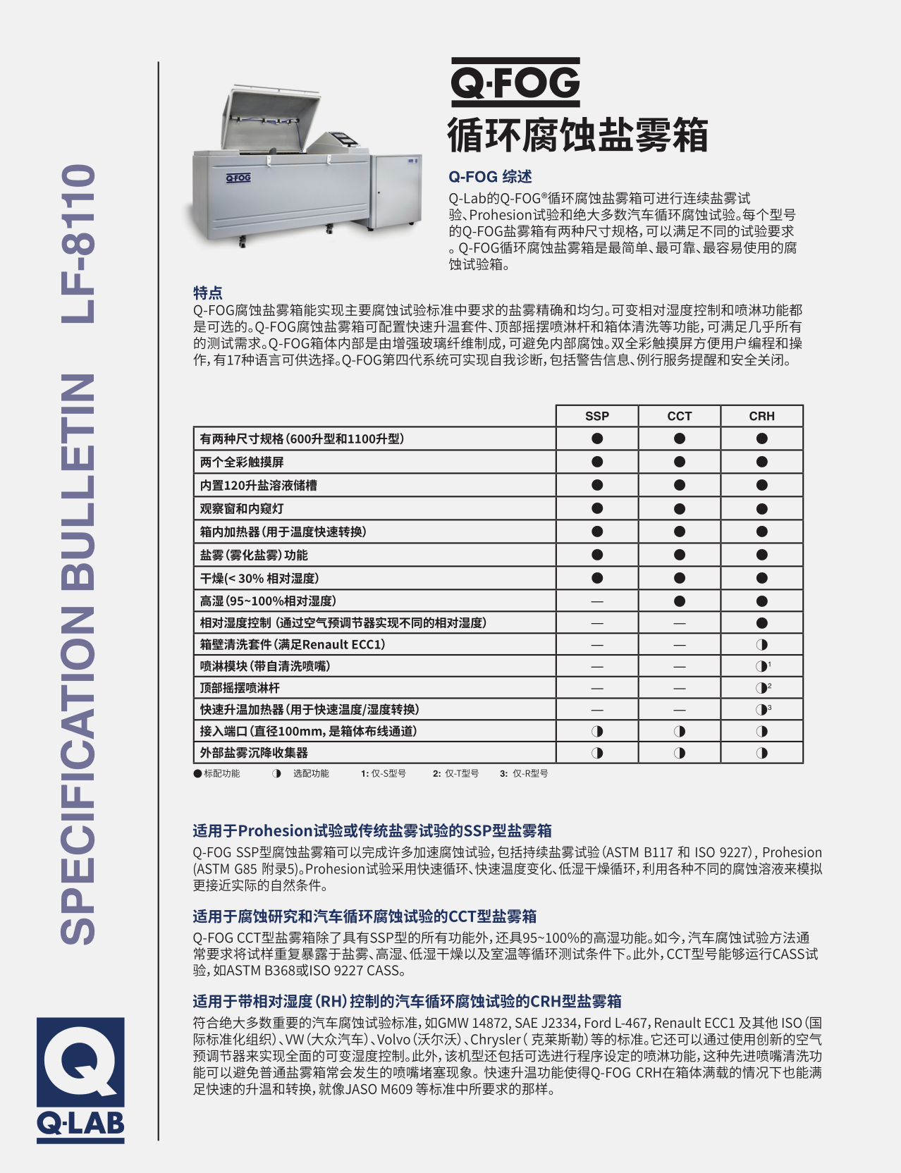 Q-FOG CRH循環(huán)腐蝕試驗箱代表了在相對濕度控制的腐蝕試驗箱性價比方面的真正突破。它可以執(zhí)行大多數(shù)汽車腐蝕試驗標(biāo)準(zhǔn)包括GMW 14872, SAE J2334以及Ford, ISO, GB/T, VW, Volvo, Chrysler, Renault, JASO的其他標(biāo)準(zhǔn)。 該循環(huán)腐蝕試驗箱具備循環(huán)腐蝕試驗箱該具備的所有特性和優(yōu)勢,并通過創(chuàng)新的空氣預(yù)調(diào)節(jié)器來實現(xiàn)全面的相對濕度控制。此外,CRH型號還具備噴淋功能,可與傳統(tǒng)鹽霧相互切換使用。與傳統(tǒng)的鹽霧噴霧功能相比,CRH噴淋功能的霧滴更大、流速更高、噴淋時間更短。噴淋裝置可安裝在中心位置,也可安裝成在頂部擺動的噴淋桿,以滿足某些關(guān)鍵腐蝕測試中的強(qiáng)制性要求。CRH還有先進(jìn)的噴嘴清潔功能,可預(yù)防其他品牌鹽霧箱經(jīng)常出現(xiàn)的噴嘴堵塞現(xiàn)象。 在一臺Q-FOG CRH箱體中,可以實現(xiàn)一系列重要的腐蝕環(huán)境的循環(huán)。即使是非常復(fù)雜的測試循環(huán)也可以很容易地用Q-FOG控制器進(jìn)行編程。Q-FOG-循環(huán)腐蝕試驗箱符合標(biāo)準(zhǔn)的詳細(xì)列表請參考LF-8131 – Standards Met by Q-FOG Testers或訪問標(biāo)準(zhǔn)頁面。