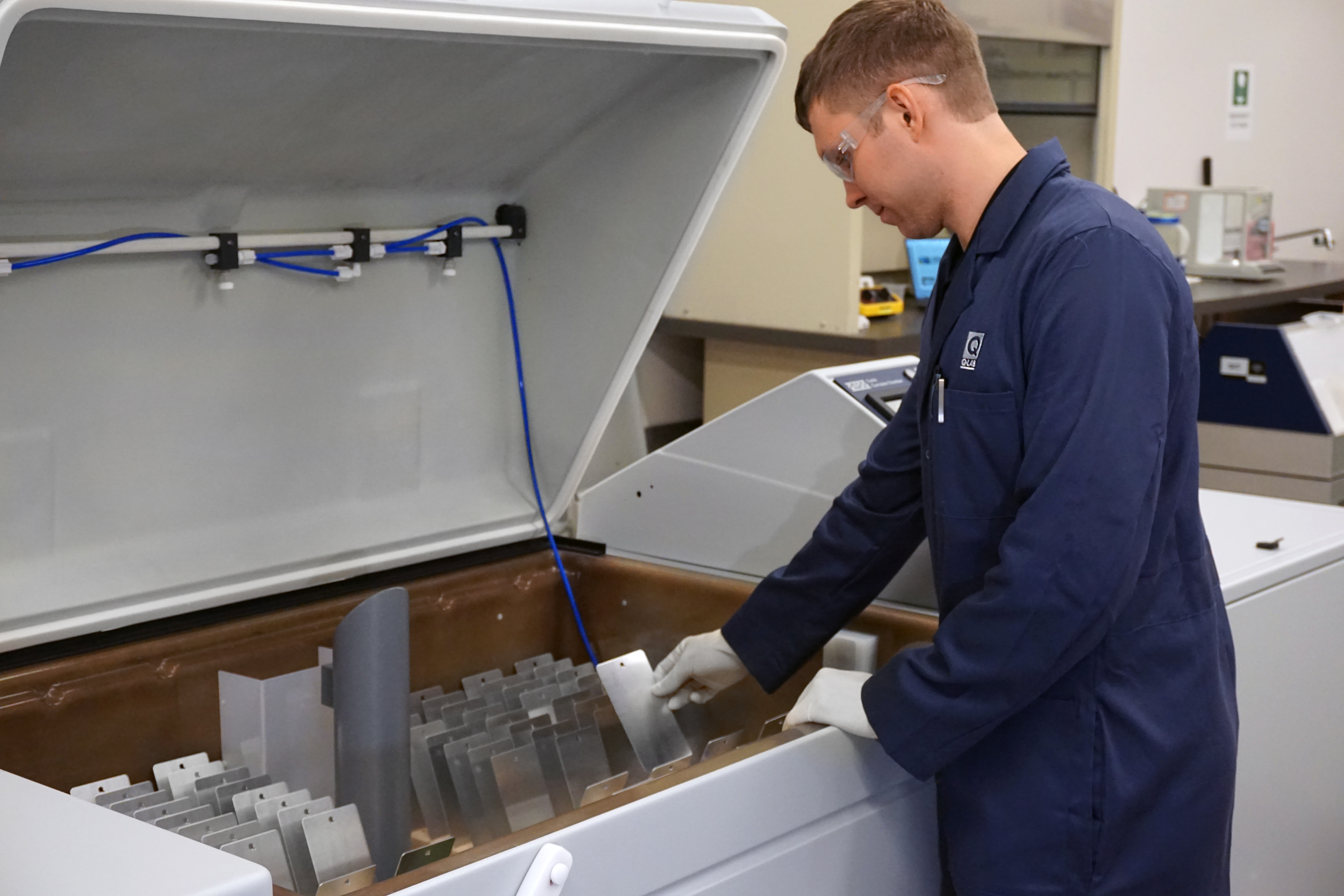 SSP機(jī)型:用于Prohesion測試或傳統(tǒng)鹽霧測試 Prohesion測試使用快速循環(huán)的、溫度變化迅速的低濕度干燥循環(huán)和不同的腐蝕性溶液提供更真實的測試。 許多研究人員發(fā)現(xiàn)該測試對工業(yè)涂料很有用。 汽車腐蝕試驗方法通常要求將樣品暴露在鹽霧、高濕度、低濕度干燥和大氣環(huán)境條件的重復(fù)循環(huán)中。這些測試方法最初是作為勞動密集型手動程序開發(fā)的。多功能Q-FOG CCT腐蝕鹽霧箱是為在單個箱體中自動執(zhí)行這些循環(huán)試驗而設(shè)計的。此外,CCT型號還可以運(yùn)行銅加速醋酸鹽霧(CASS)測試,例如ASTM B368或ISO 9227 CASS。 參見LF-8110 - Q-FOG 規(guī)格說明了解對比信息, 或參見特點(diǎn)標(biāo)簽。